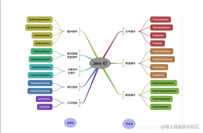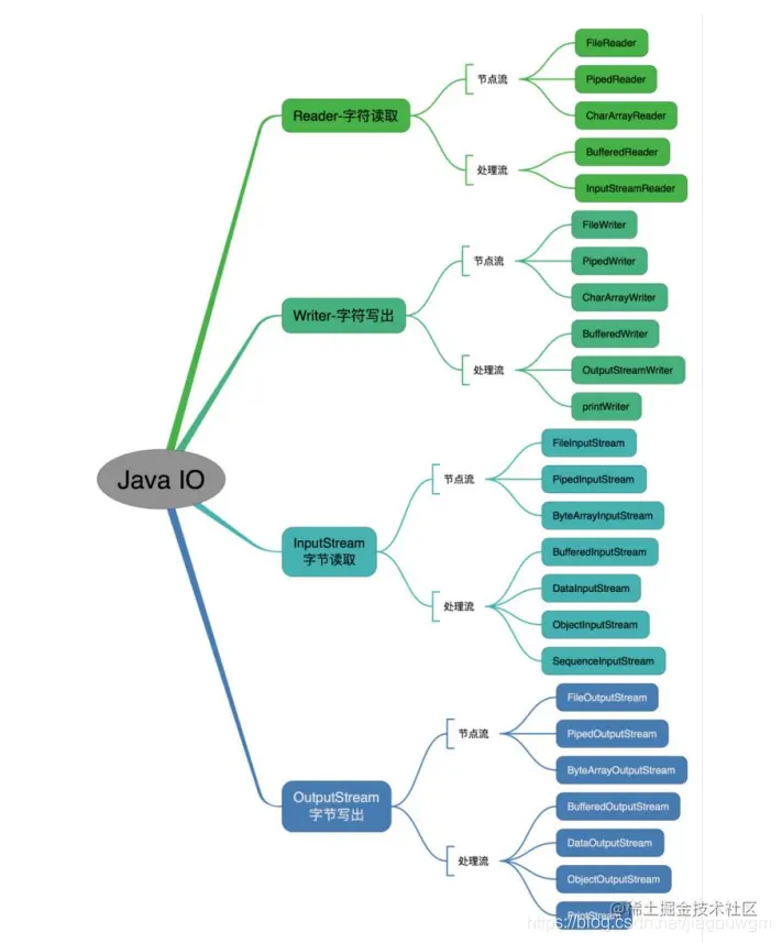 - 按照流的⻆⾊划分为节点流和处理流。 Java Io 流共涉及 40 多个类,这些类看上去很杂乱,但实际上很有规则,⽽且彼此之间存在⾮常紧密的联系, Java I0 流的 40 多个类都是从如下 4 个抽象类基类中派⽣出来的。