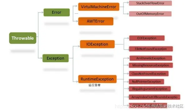 - Exception(异常):是程序本身可以处理的异常。Exception 类有⼀个重要的⼦类RuntimeExceptionRuntimeException 异常由 Java 虚拟机抛出。NullPointerException(要访问的变量没有引⽤任何对象时,抛出该异常)、ArithmeticException(算术运算异常,⼀个整数除以 0时,抛出该异常)和 ArrayIndexOutOfBoundsException (下标越界异常)。