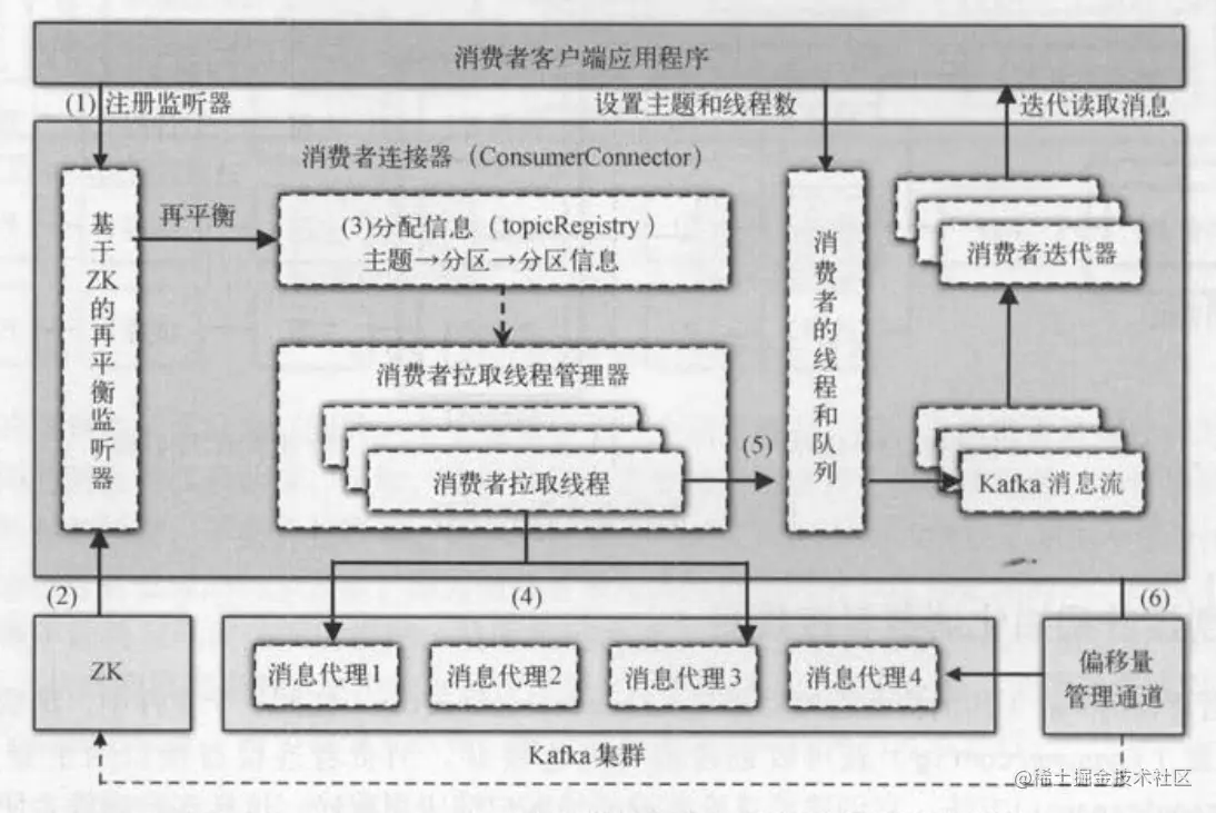 接着拉取线程开始拉取对应的分区消息(4),并将拉取到的消息放到每个线程的队列中(5),最后消费者客户端就可以从队列中读取什i消息了 。