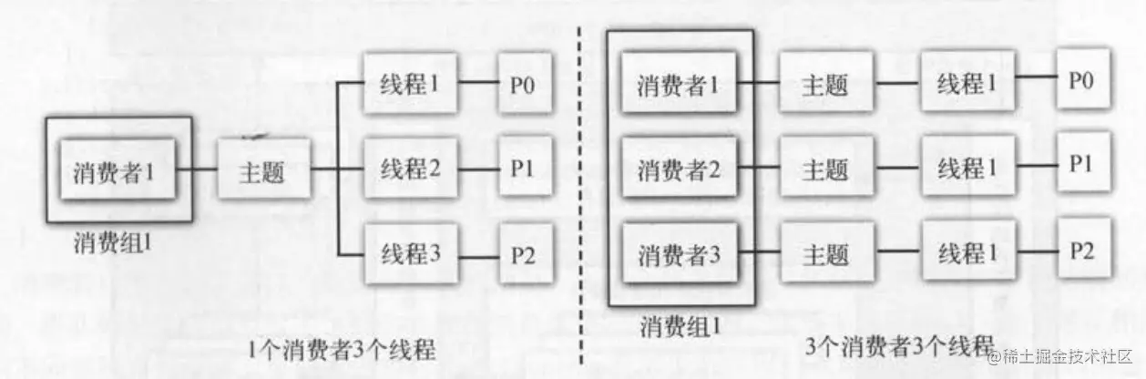 如图 (左)所示-个消费者进程订阅的主题设置了 3个线程。而图 (右)有3个消费者进程,但每个消费者订阅的主题只有一个线程。 这两种方式的效果应该