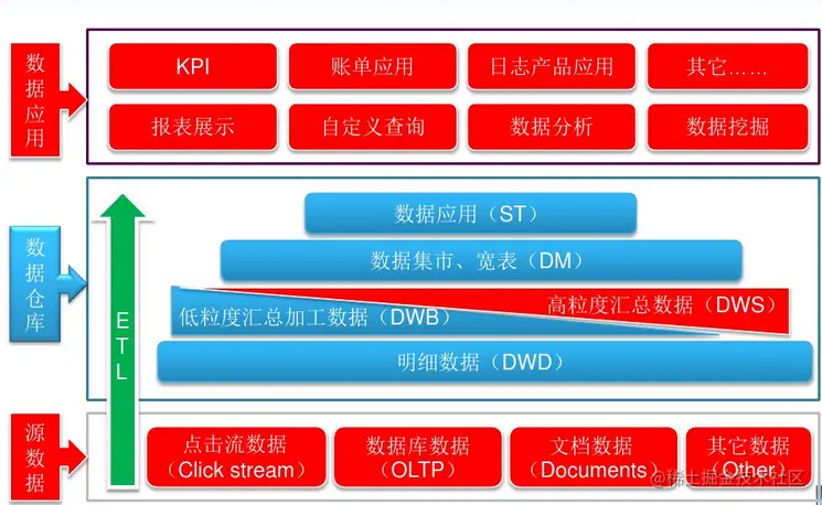 DWB:data warehouse base 基础数据层,存储的是客观数据,一般用作中间层,可以认为是大量指标的数据层。