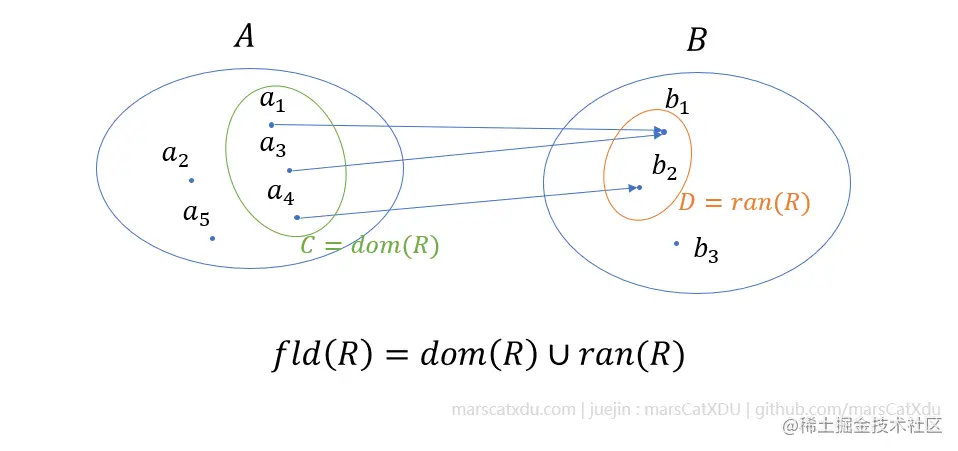 对集合 A、B 的关系 R,其定义域记作 domR,值域记作 ranR。另,将 fldR=domR∪ranR 称作 R 的域(Field)。如下图所示