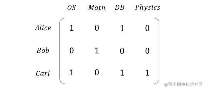以上面的选课关系 R 为例,我们可以为其建立一个关系矩阵 MR