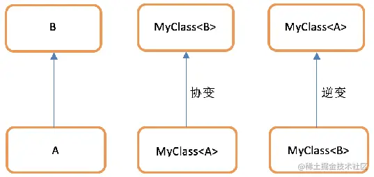 逆变的定义:假如定义了一个MyClass的泛型类,其中A是B的子类型,同时MyClass又是MyClass的子类型,那么我们就可以称MyClass在T这个泛型上是逆变的。