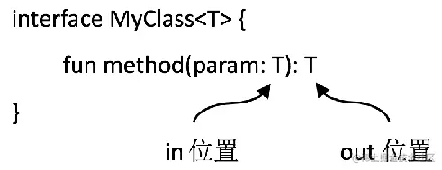 在开始学习协变和逆变之前,我们还得先了解一个约定。一个泛型类或者泛型接口中的方法,它的参数列表是接收数据的地方,因此可以称它为in位置,而它的返回值是输出数据的地方,因此可以称它为out位置,如下图所示。