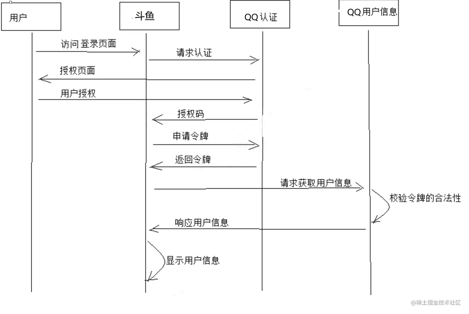 客户端携带令牌访问资源服务器的资源,斗鱼网站携带令牌请求访问QQ服务器获取用户的基本信息。
