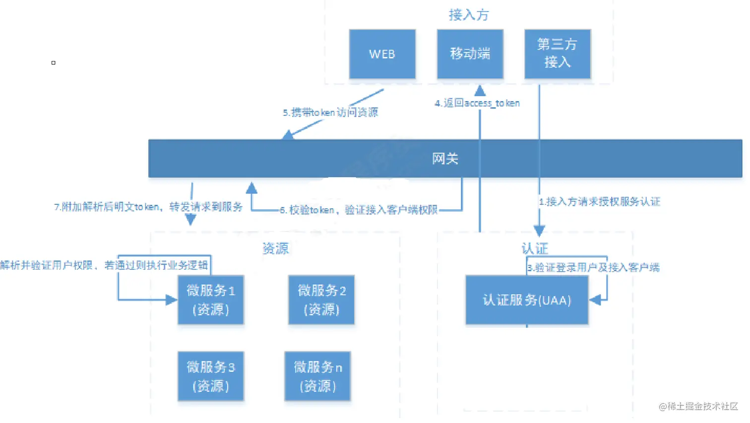 jwt令牌对API网关内的微服务资源进行访问。 API网关对令牌解析、并验证接入方的权限是否能够访问本次请求的微服务。- 如果接入方的权限没问题,