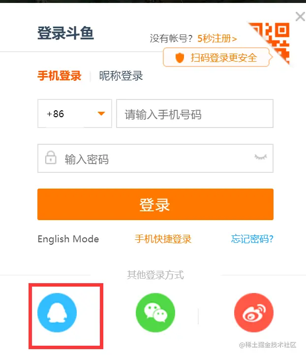 用户进入斗鱼的登录页面,点击微信的图标以 QQ账号登录系统,用户是自己在 QQ里信息的资源拥有者。