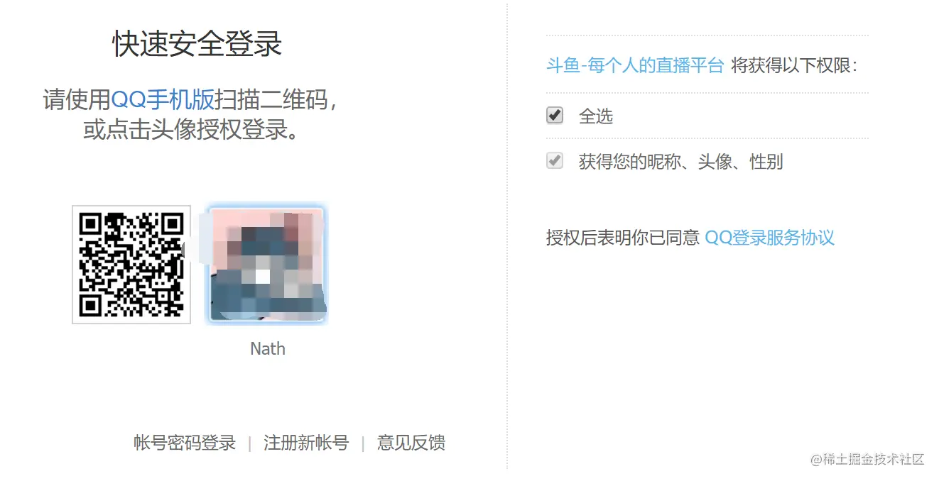 点击 QQ开始给斗鱼授权,资源拥有者登录 QQ表示资源拥有者同意给客户端授权, QQ会对资源拥有者的身份进行验证, 验证通过后, QQ会询问用户是否给授权斗鱼访问自己的 QQ数据,用户点击"确认登录"表示同意授权, QQ认证服务器会颁发一个授权码,并重定向到斗鱼的网站。