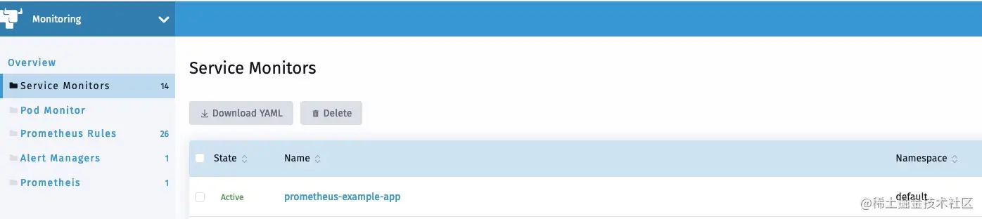 现在,我们来部署ServiceMonitor,Prometheus用它来收集组成prometheus-example-app Kubernetes服务的pod。