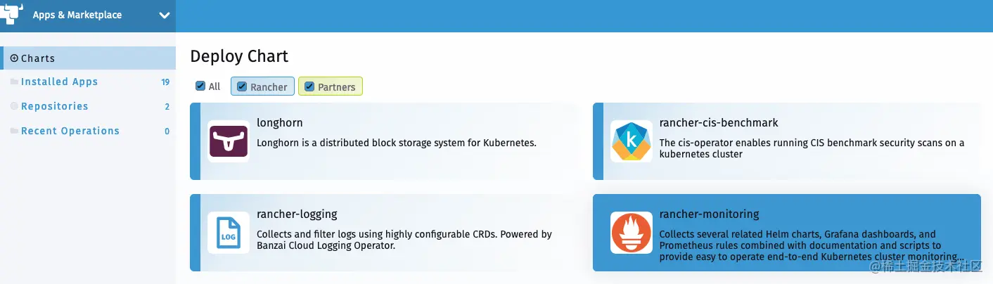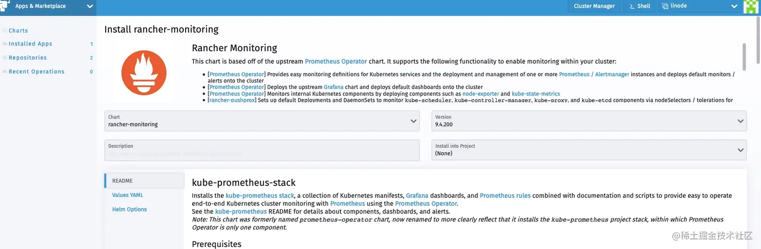 在Rancher 2.5中安装Prometheus极为简单。仅需访问Cluster Explorer -> Apps并安装rancher-monitoring即可。