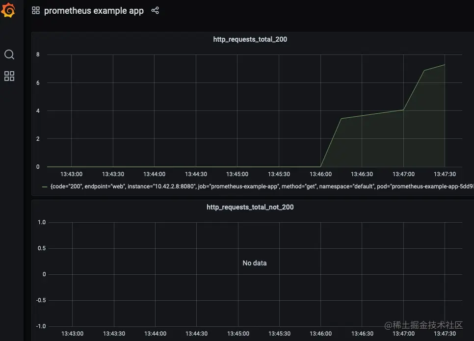 现在,用户应该能够在Grafana中访问prometheus example app的仪表盘。