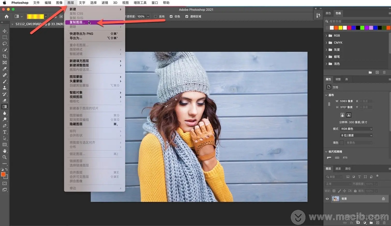 在菜单栏找到图层-复制图层,如图: