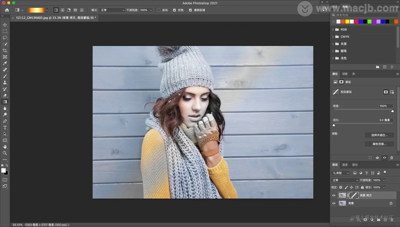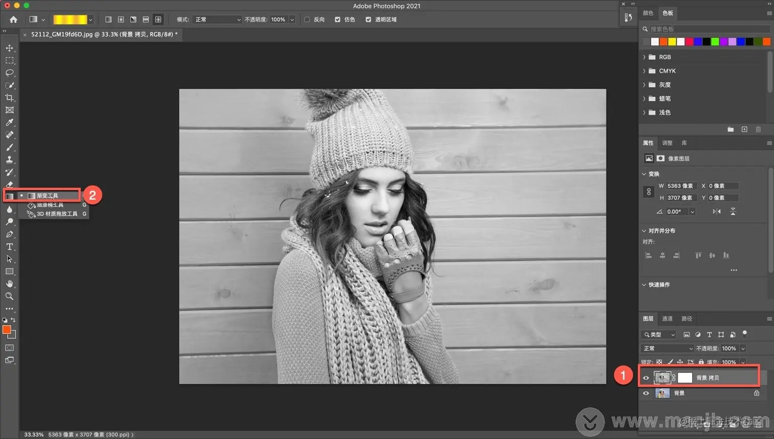 点击选中蒙版后,找到左侧工具栏渐变工具,点击使用渐变工具,如图