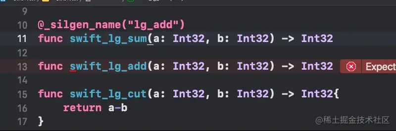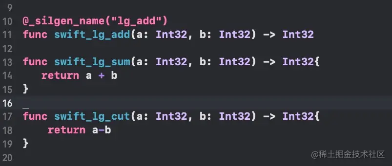 这个就是解释了 函数写法 注意特别提醒关键字下面 和 上面说明两个函数要一上一下中间不能有其他函数隔开 如果 关键字下面是 别的函数了 这个时候 调用 swift_lg_sum 就调用了 "lg_add" 而不是 swift_lg_add 调用了 特别注意一下