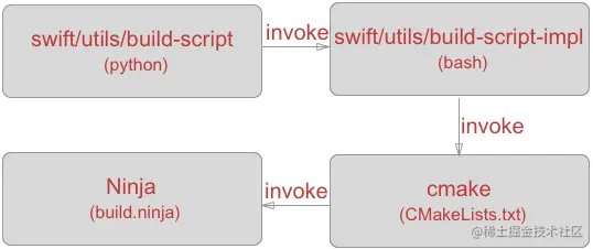 Now the following overviwe diagram shows us the build-script will call a bash script named build-script-impl which will then invoke cmake, a build generator, to generate build.ninja to indicate Ninja how to build the whole project.