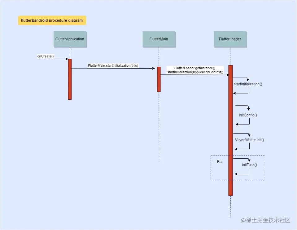 Flutter应用是由平台(及native)来创建、初始化并启动的,这里我们以android为例,对启动过程做一个走马观花式的了解,旨在对平台端的工作有个大致了解。