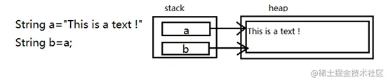 如果我们定义了不止一个引用指向同一个对象,那么这些引用是不相同的,因为引用也是一种数据类型,需要一定的内存空间(stack,栈空间)来保存。但是它们的值是相同的,都指示同一个对象在内存(heap,堆空间)的中位置。比如: