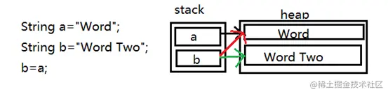 如图,开始b 的值为绿线所指向的“Word Two”,然后 b=a; 使 b 指向了红线所指向的”Word“.
