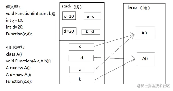 在Java中类型可分为两大类:值类型与引用类型 值类型就是基本数据类型(如int ,double 等),而引用类型,是指除了基本的变量类型之外的所有类型(如通过 class 定义的类型)。所有的类型在内存中都会分配一定的存储空间(形参在使用的时候也会分配存储空间,方法调用完成之后,这块存储空间自动消失), 基本的变量类型只有一块存储空间(分配在stack中), 而引用类型有两块存储空间(一块在stack中,一块在heap中),在函数调用时Java是传值还是传引用,这个估计很多人至今都很糊涂,下面用图形与代码来解释: