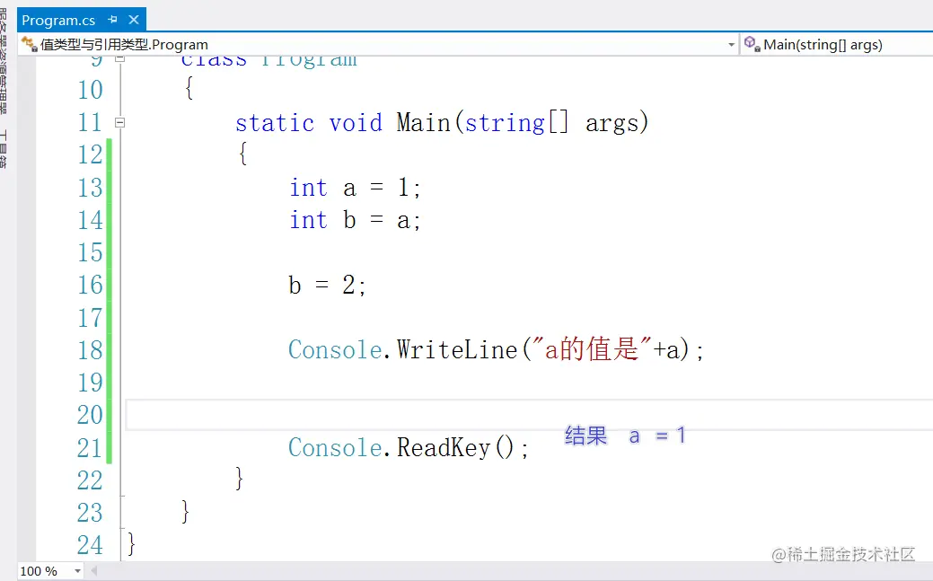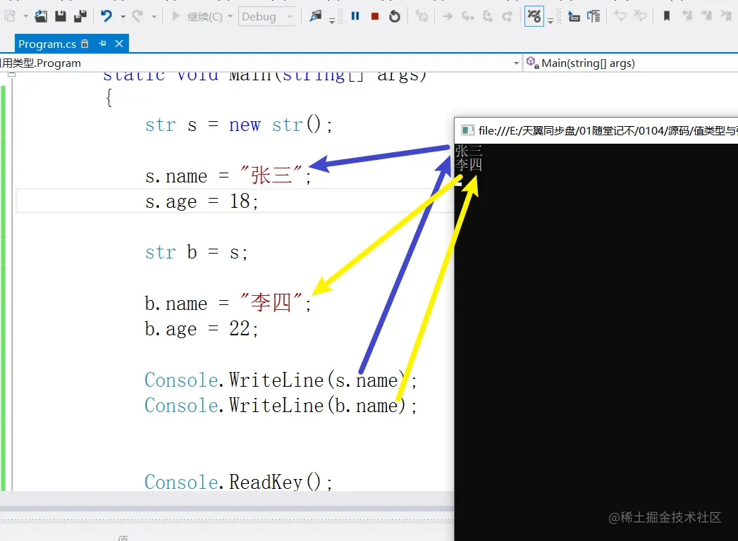 0104随堂笔记 ifubing 2021-01-04 102 阅读1分钟 0104随堂笔记 对象的初始化器 实例化一个对象,同时给对象的属性与字段赋值 类名 对象名 = new 类名(){字段1=值1,字段n=值n} 字段与属性的区别 用法最终都是一样的 对象.属性 对象.字段 对象.属性=值 对象.字段=值 值类型与引用类型 int类型演练 struct类型的演练 值类型 class类型的演练 引用类型
