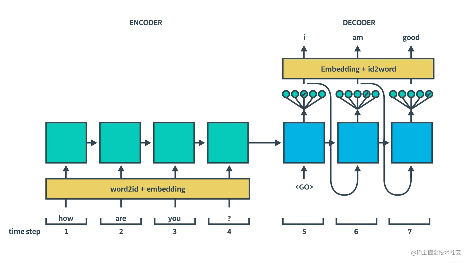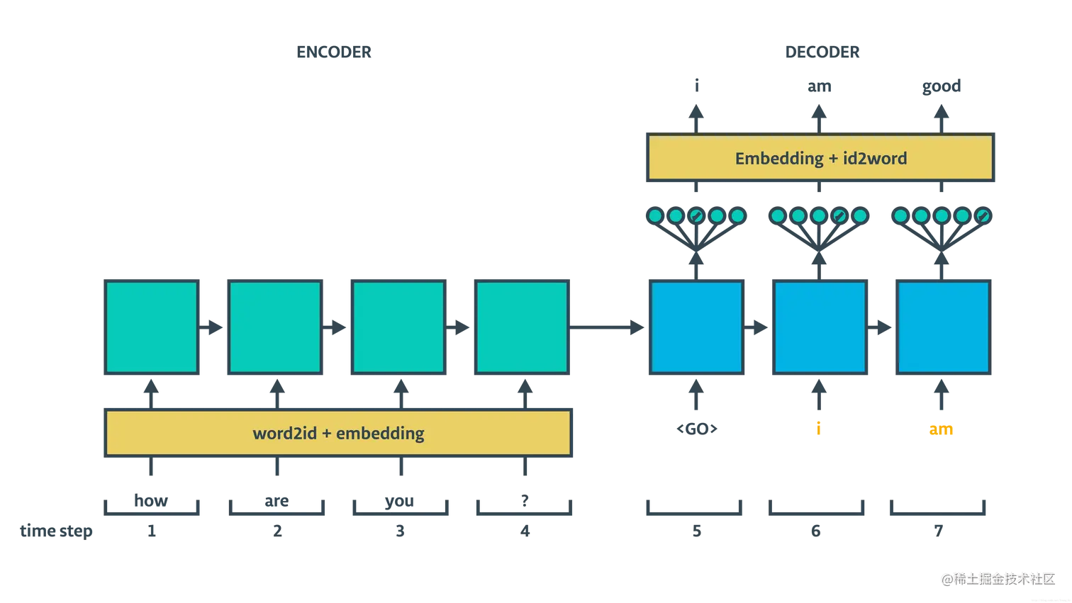 基于 RNN 的 seq2seq 架构包含 encoder 和 decoder,decoder 部分又分 train 和 inference 两个过程,具体结构如下面两图所示:
