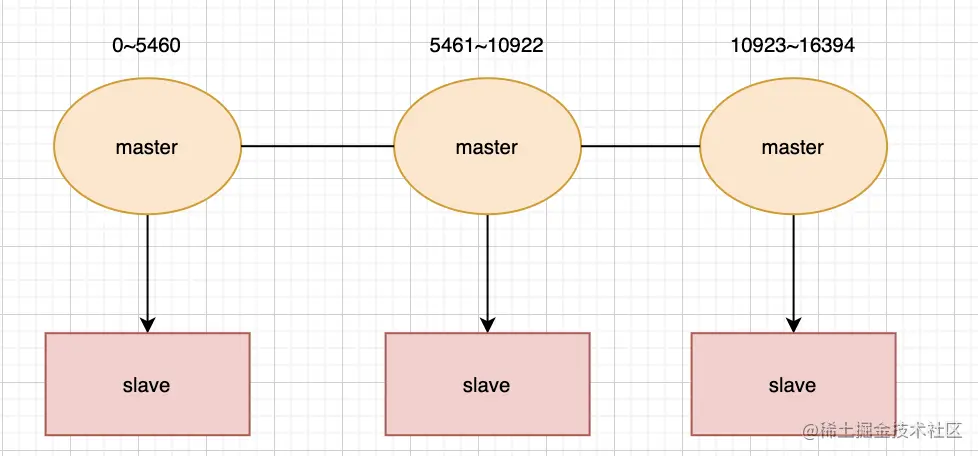 一个cluster集群中总共有16384个节点,集群会将这16384个节点平均分配给每个节点,当然,我这里的节点指的是每个主节点,就如同下图: