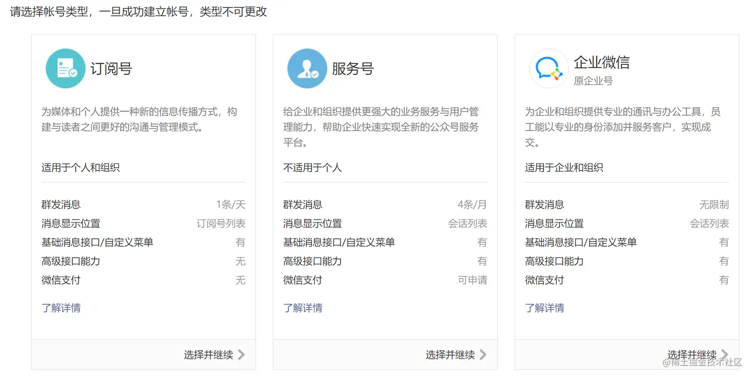 企业比个人呢多了服务器号的选择,个人只能使用订阅号。而且公众平台的新功能,