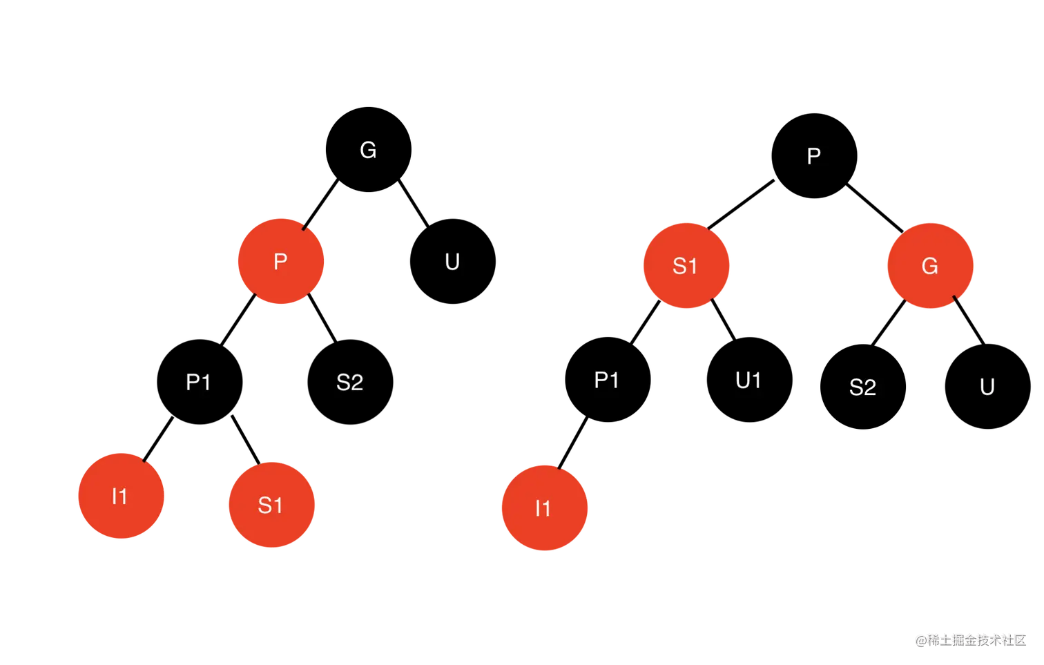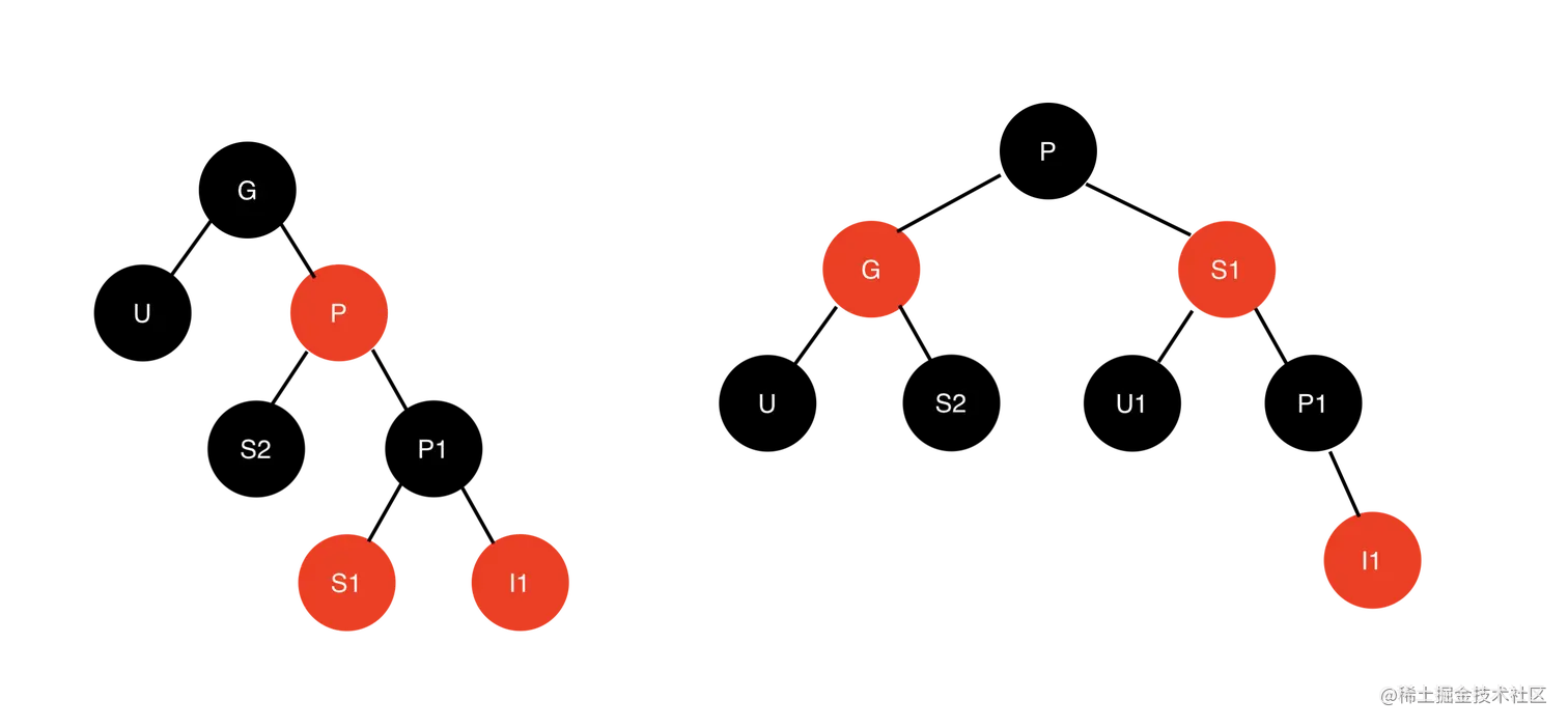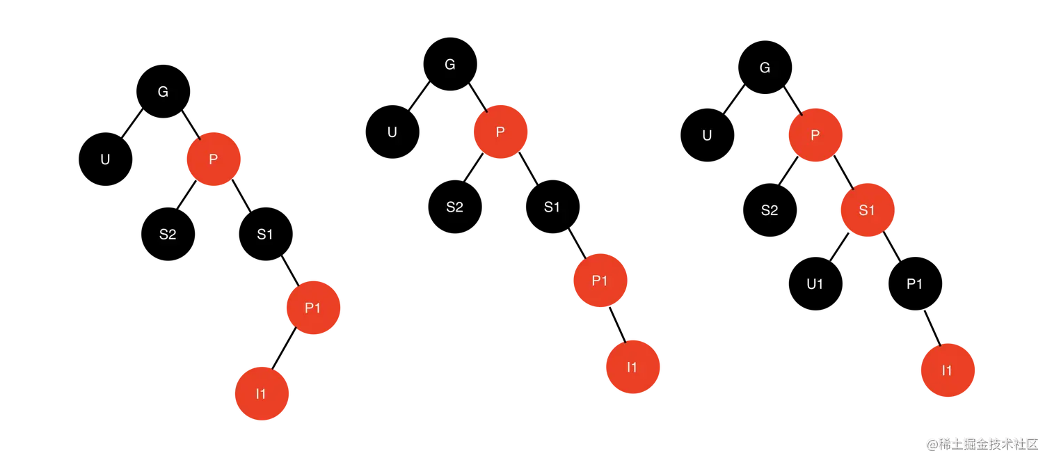 如下图所示,图1中 P1-I1 右旋变成与图2一样的结构(只看颜色结构),因此形成父节点在祖父节点右侧情况,同时左节点为空,同时图3上部分以S1作为插入节点,一样的结构,除了叔叔节点变成了黑色节点