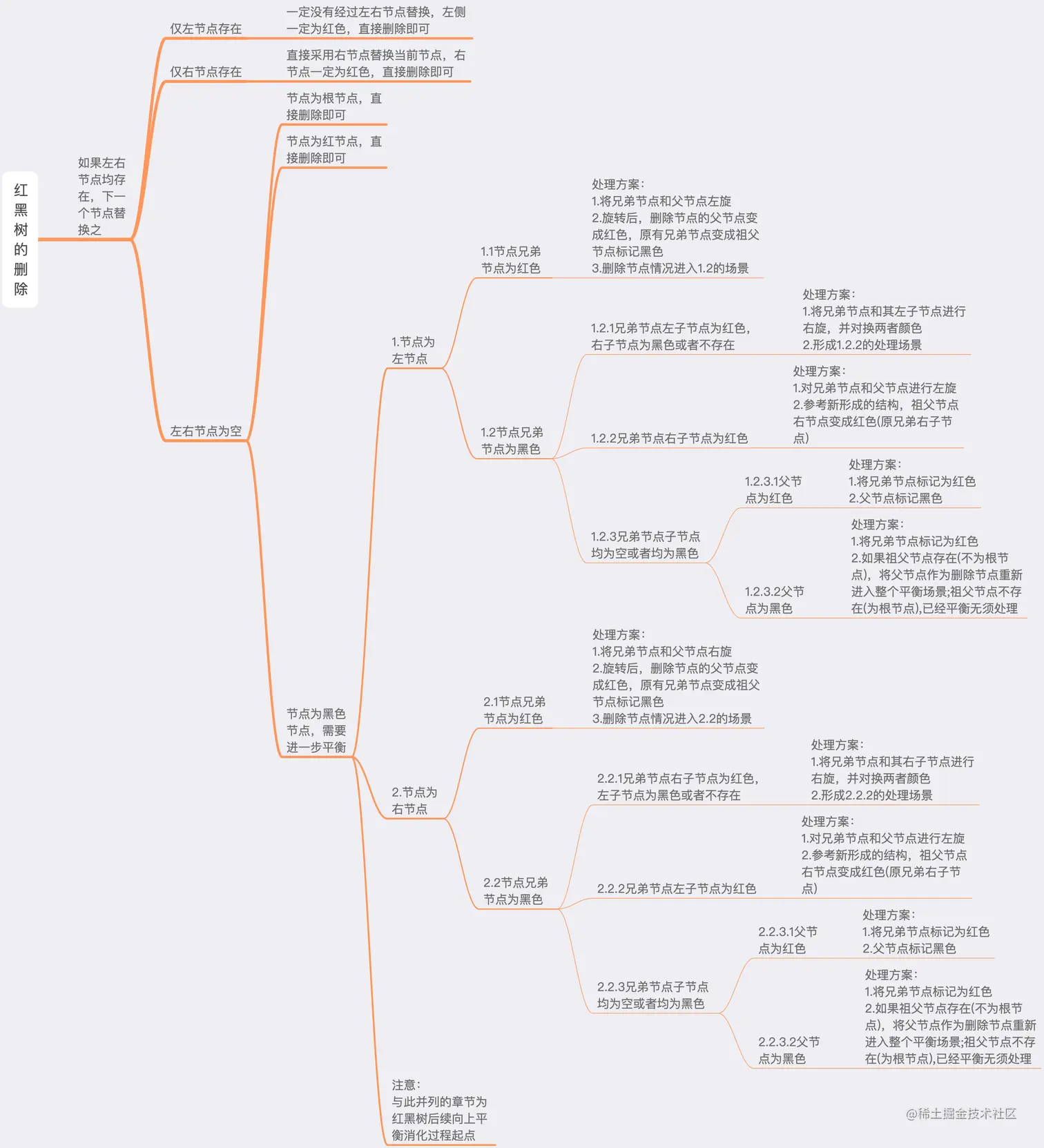 与1章节对称,此时删除节点在父节点右侧,且为黑色,因此需要手段来平衡少掉的那个黑色节点,只能靠父节点和兄弟节点情况来进行平衡