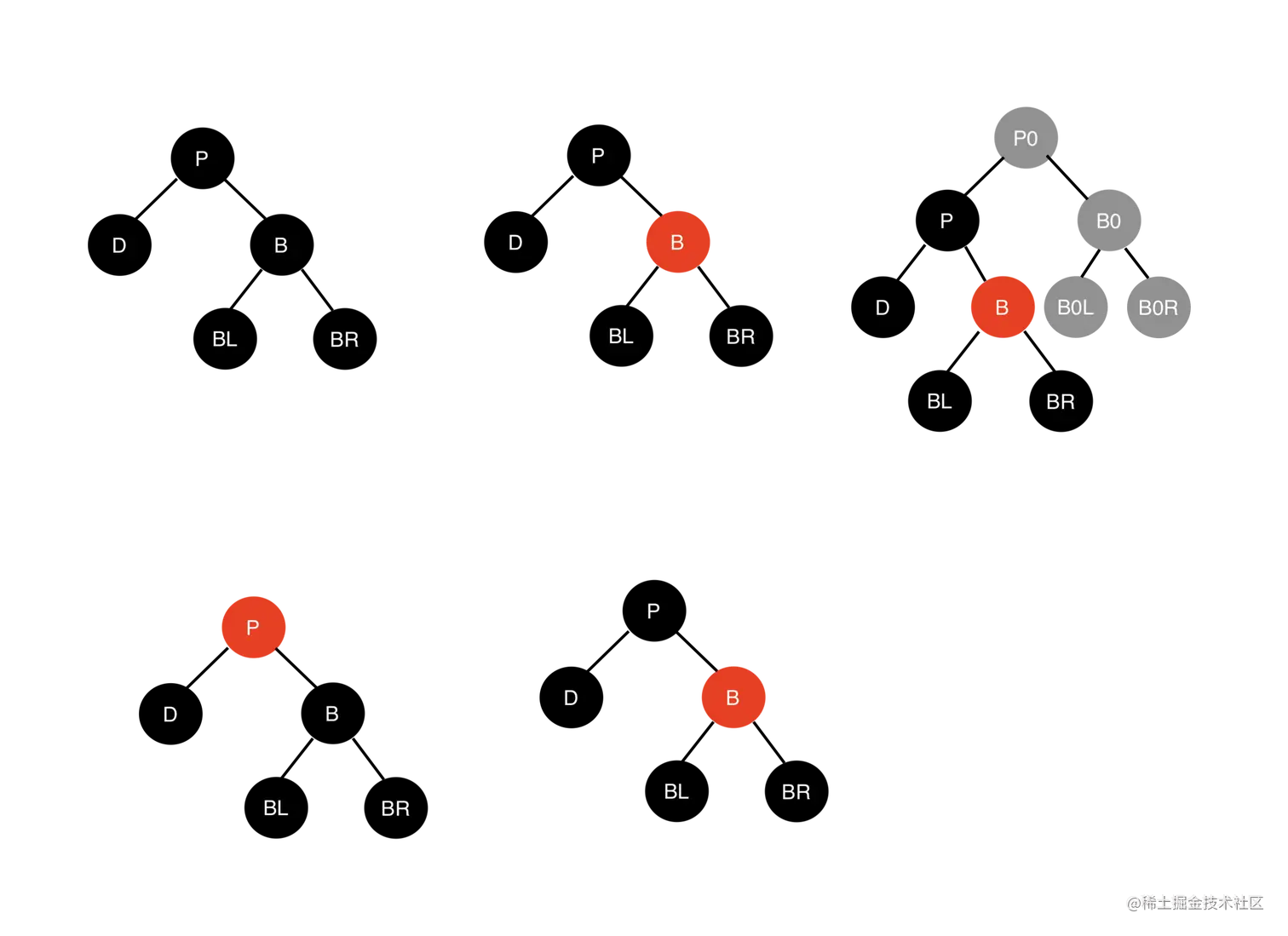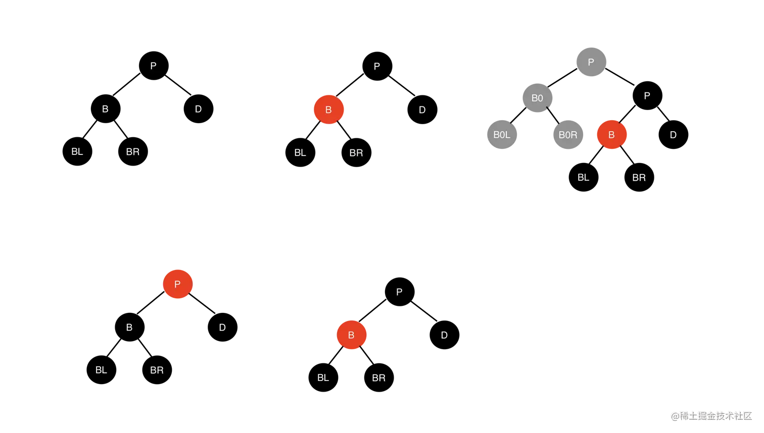 1.将父节点和祖父节点整体左旋旋(例如图2 S1-P1,图3 G-P,也可以采用前面介绍的替换式左旋方案,不用变色即可解决方案)