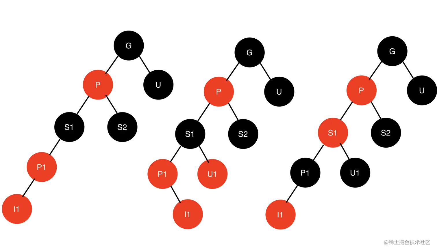 如下图所示,图1中P1-I1左旋变成与图2一样的结构,因此形成父节点在祖父节点左侧情况,同时右节点为空,同时图3上部分以S1作为插入节点,一样的结构,除了叔叔节点变成了黑色节点