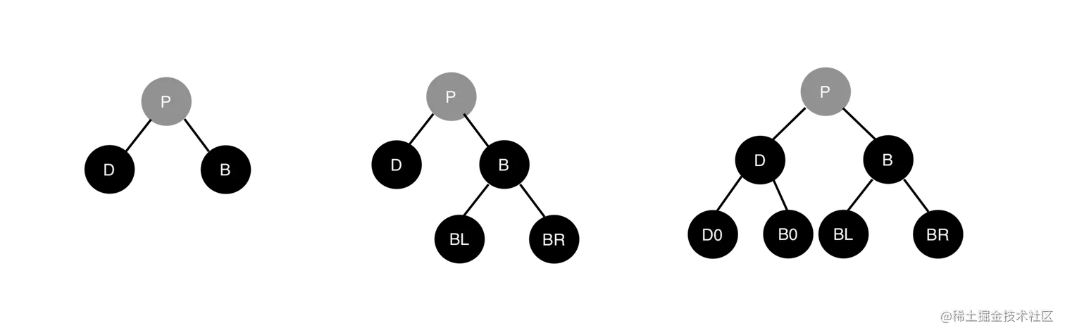 3.父节点为黑点(如下图第一排所示),已经无法通过变色来处理本机减少的黑色节点问题;但如果父节点已经是根节点,则整体减少一级黑色节点平衡结束;否则,将父节点作为删除节点,来平衡减少的一个黑色节点,自下而上重新开始整个平衡步骤(如下图第一排最后一个所示)