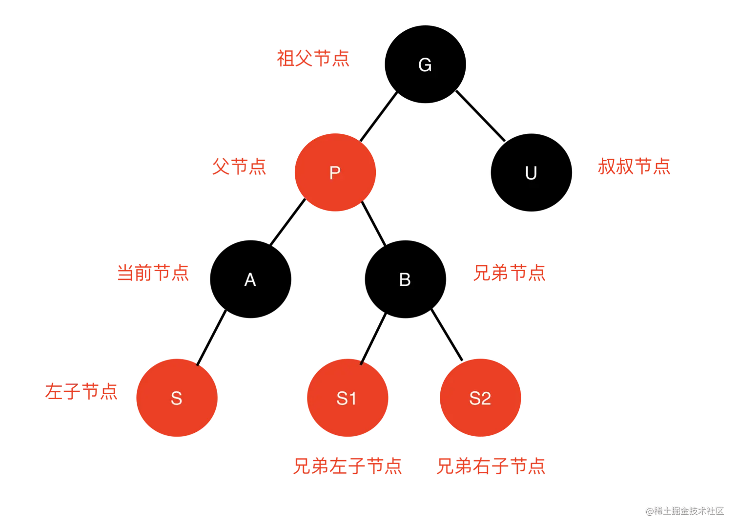 此时插入了红色节点,其和父节点通通为红色,已经不满足红黑树性质4,且已知条件为: