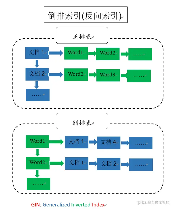 全文检索的基础就是GIN索引,Generalized Inverted Index,也就是通用倒排索引,是一个存储对(key, posting list)集合的索引结构,其中key是一个键值,而posting list 是一组出现过key的位置。如(‘hello', 2,3)中,表示hello在2和3这两个位置出现过。