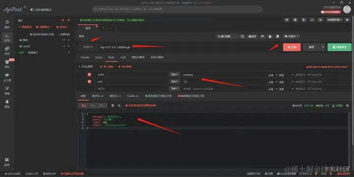 使用apipost进行接口测试,输入url地址,请求方法,参数点击发送查看接口是否正确。