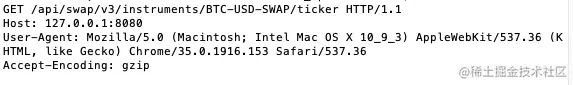 可以看到请求报文中的链接为:/api/swap/v3/instruments/BTC-USD-SWAP/ticker,是要请求BTC本位的永续合约行情数据。