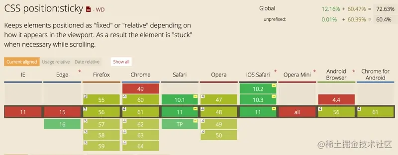 使用css提供的css方法进行滚动吸顶功能,下图是此css效果的兼容性,在ios6+以上有比较好的性能