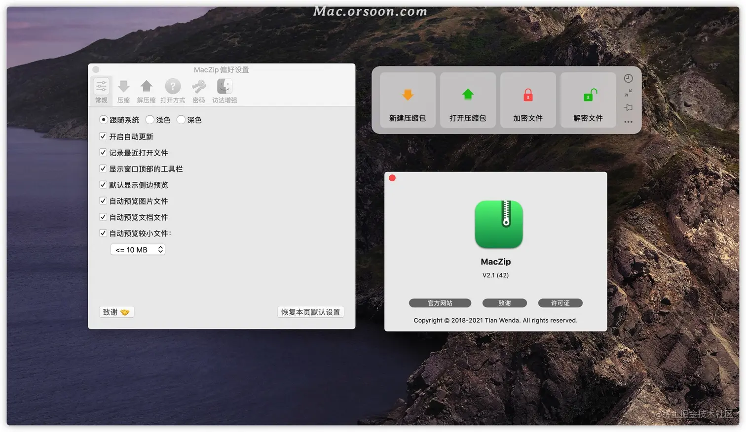 MacZip 2.1 中文版体验:mac.orsoon.com/Mac/168879.html 完美兼容 Big Sur,支持 Silicon M1 支持 Big Sur, Catalina, Mojave, High Sierra, Sierra, EI Caption, Yosemite 苹果操作系统。