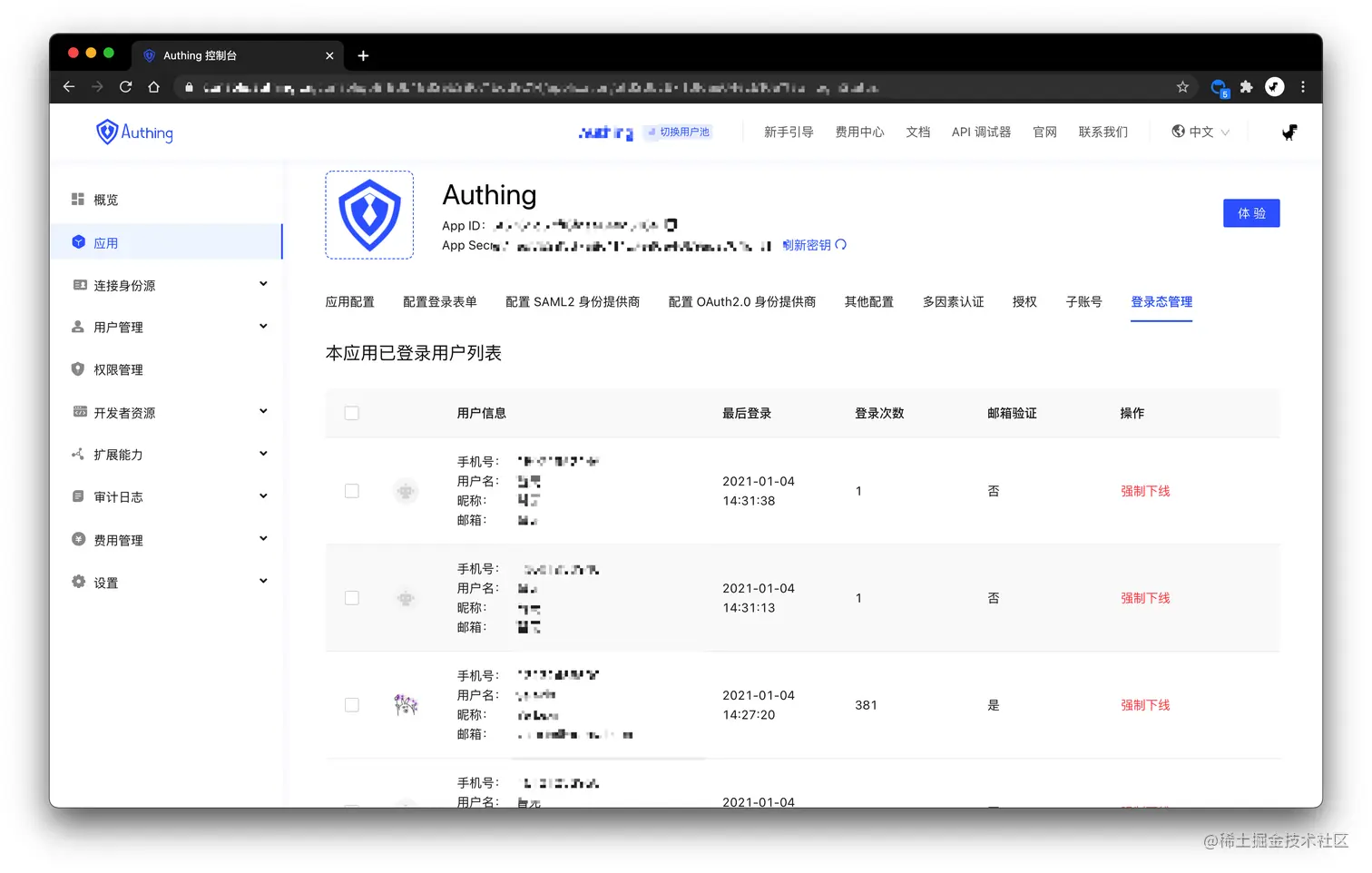 支持应用级别用户登录状态管理,可以对 指定 用户 进行 强制下线 操作 。
