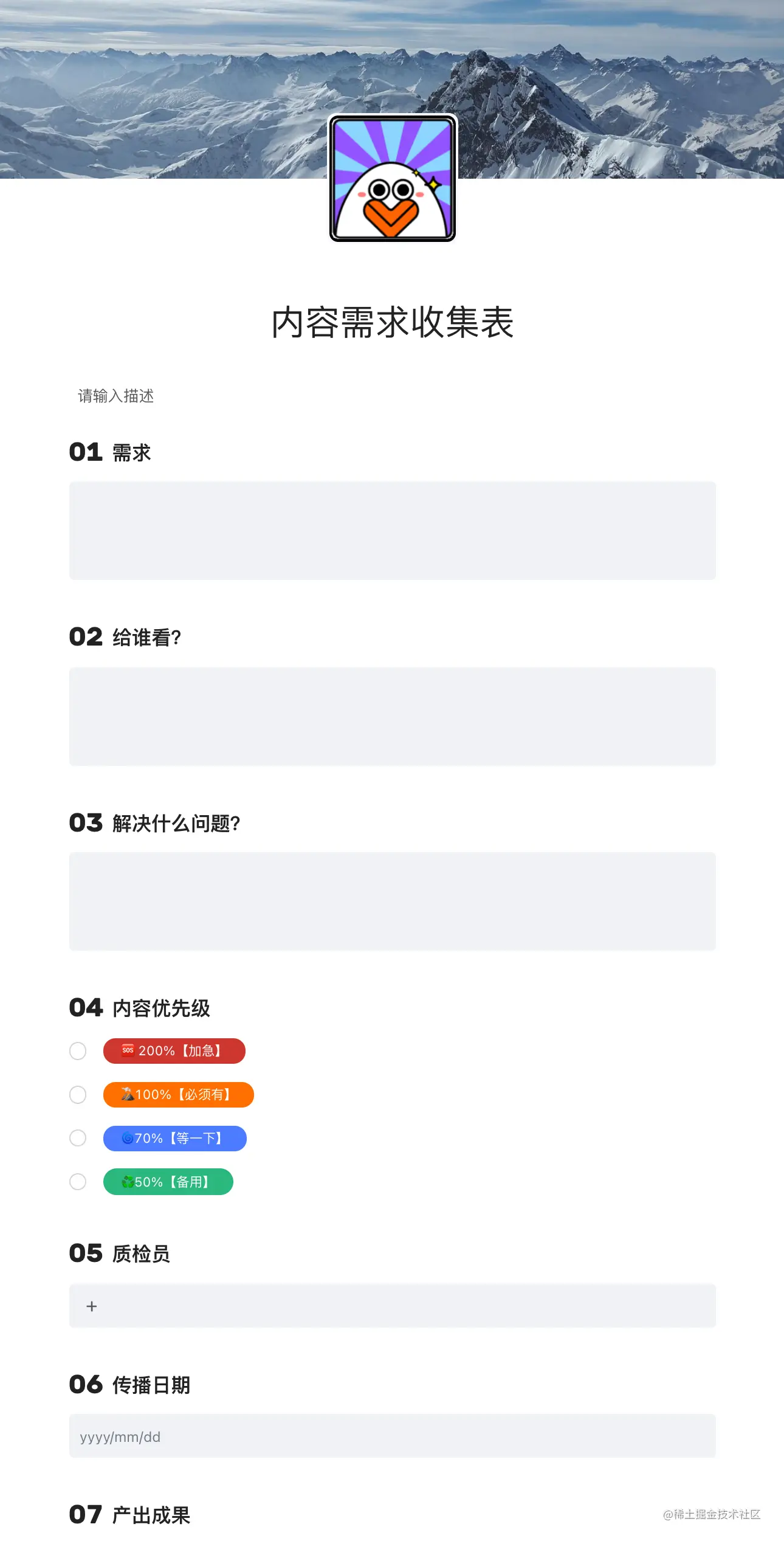 你不仅可以用维格表来搭建「需求池」,还可以将需求池拆分成若干个「收集表」,在提交需求前按照要求进行填写,保证需求内容的描述无误。