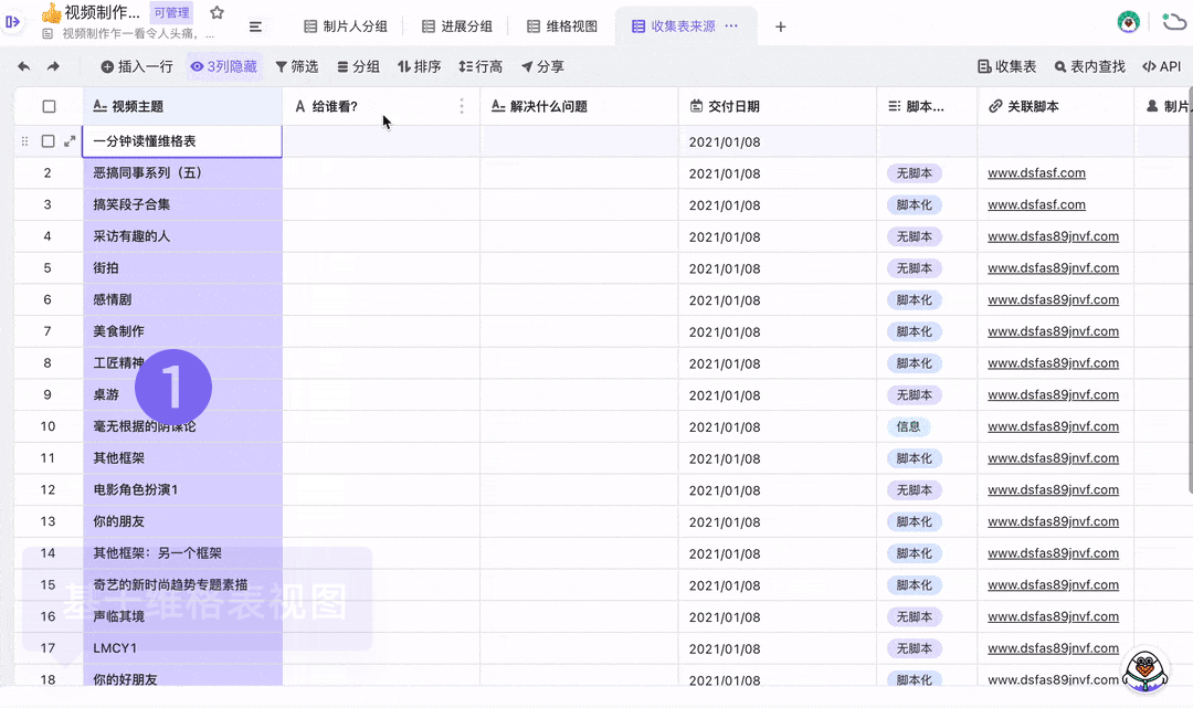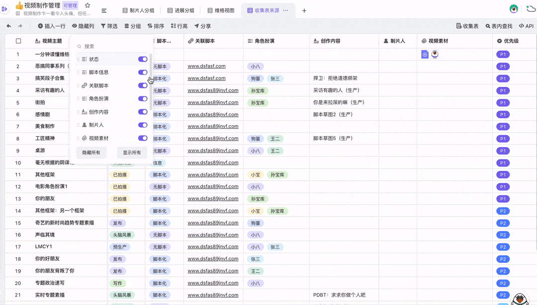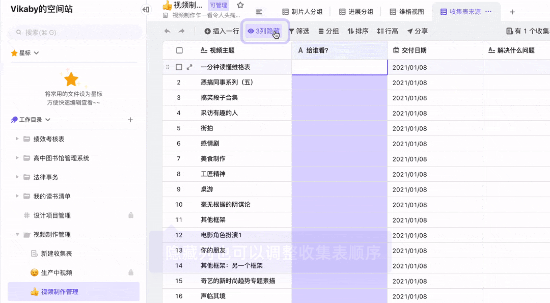 一个维格表可以生成许多的视图,你可以根据业务的需要进行设置显示或隐藏维格列,调整维格列的顺序,最终形成你想要的收集表内容。