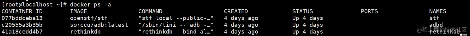 一定要注意启动顺序,stf 依赖 rethinkdb,所以要先启动 rethinkdb,启动完成后使用: docker ps -a 查看是否启动成功,顺便获取stf的container ID。