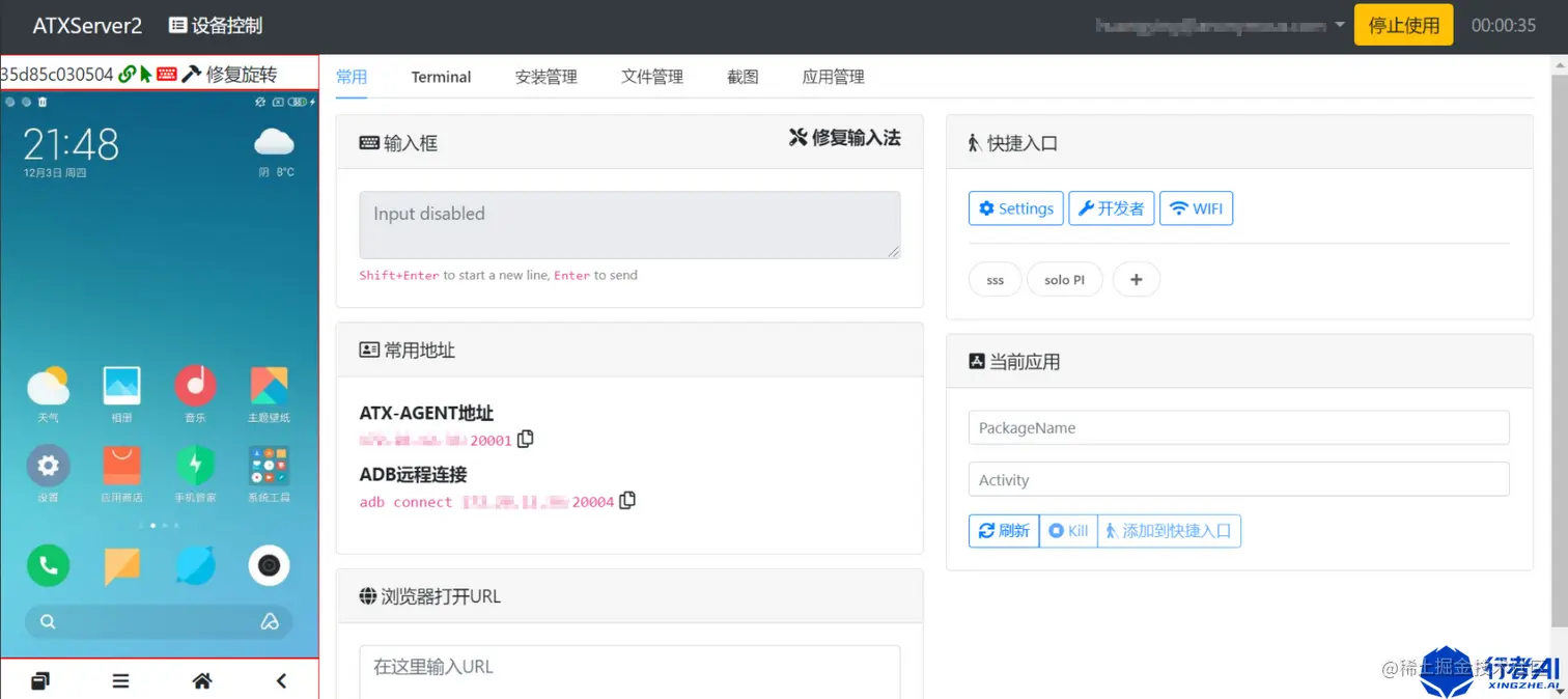 - atxserver2 :这一部分主要负责处理数据,显示与用户的前端交互等等,所以单独运行atxserver2也可以看到效果,当运行起来以候访问: IP:4000 就可以看到web界面。