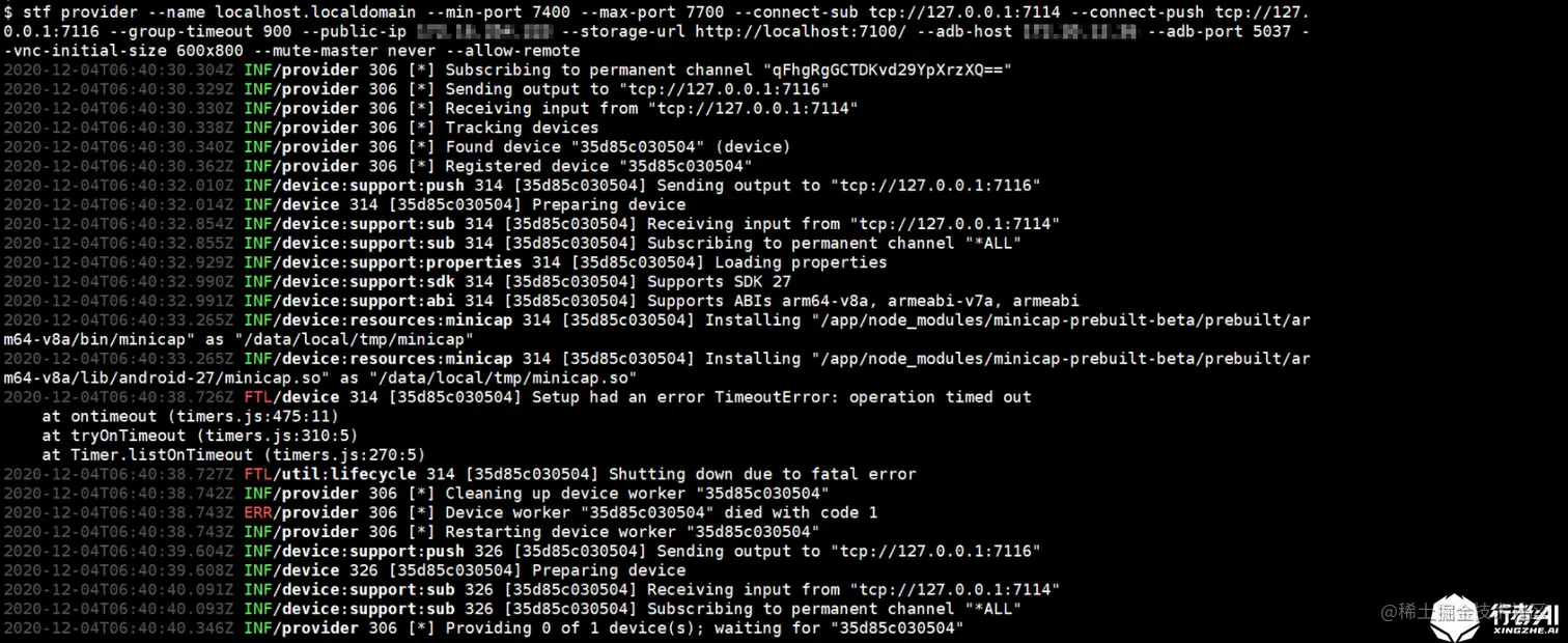 stf provider --name localhost.localdomain --min-port 7400 --max-port 7700 --connect-sub tcp://127.0.0.1:7114 --connect-push tcp://127.0.0.1:7116 --group-timeout 900 --public-ip 宿主机IP地址 --storage-url http://localhost:7100/ --adb-host 局域网windowsIP地址 --adb-port 5037 --vnc-initial-size 600x800 --mute-master never --allow-remote