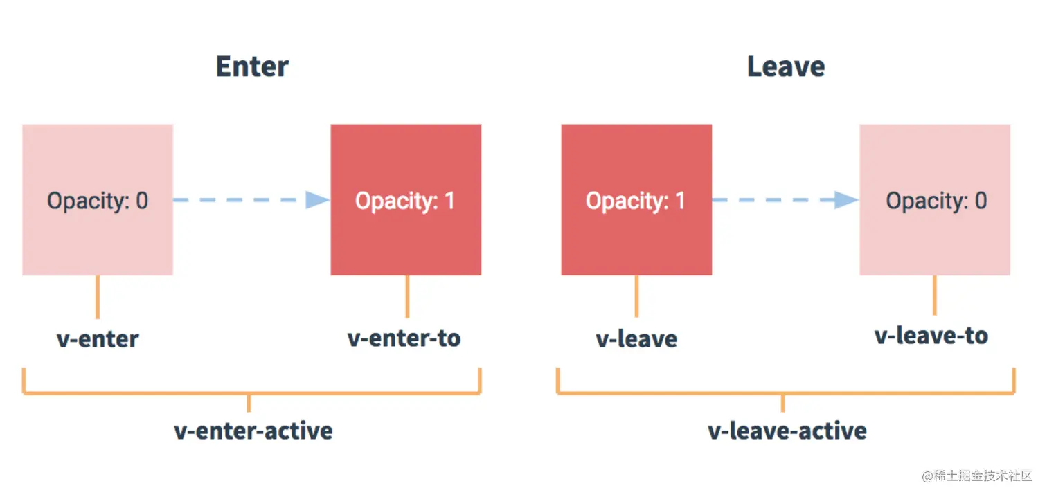 - v-enter-to : 定义进入过渡的结束状态。在元素被插入之后下一帧生效 (与此同时 v-enter 被移除),在过渡/动画完成之后移除。