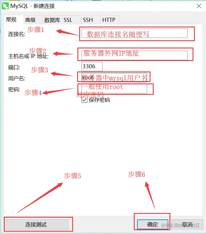打开 Navicat软件,点击左上方的 "连接",设置一下数据库的连接名,服务器外网ip地址,mysql用户名及密码等,