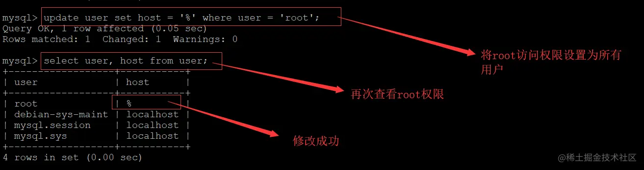 上面显示 root 用户只用访问本地的权限,我们需要通配符 % 来修改 root 用户对应的 host 字段,使其具有访问所有 ip 地址的权限: