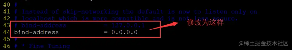 将 bind-address = 127.0.0.1 这行注释掉或者改为你想要使用的客户端主机 ip。如下图所示: