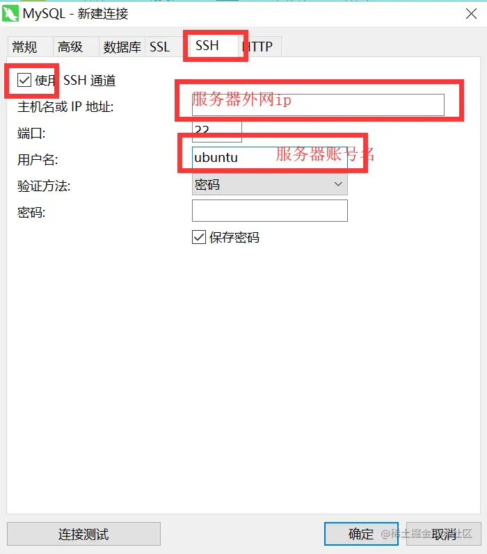 连接方法:ssh 中输入自己服务器的外网 ip 地址,登录服务器账号和密码